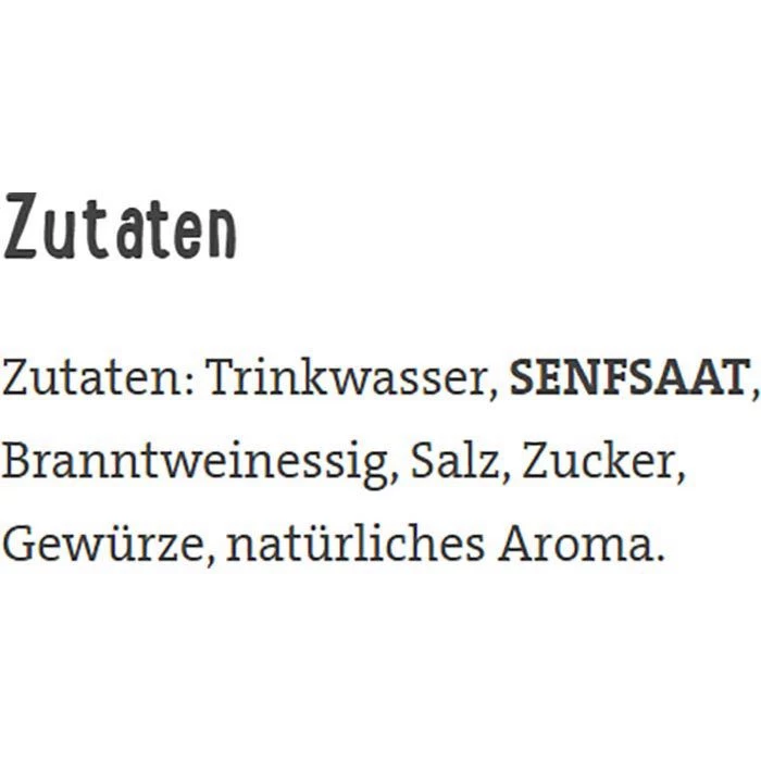 Wasser, SENFSAAT, Branntweinessig, Salz, Zucker, Gewürze, natürliches Aroma