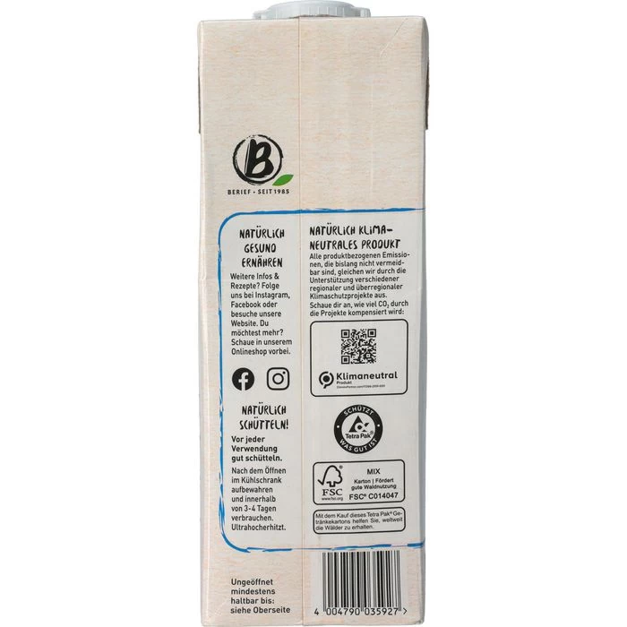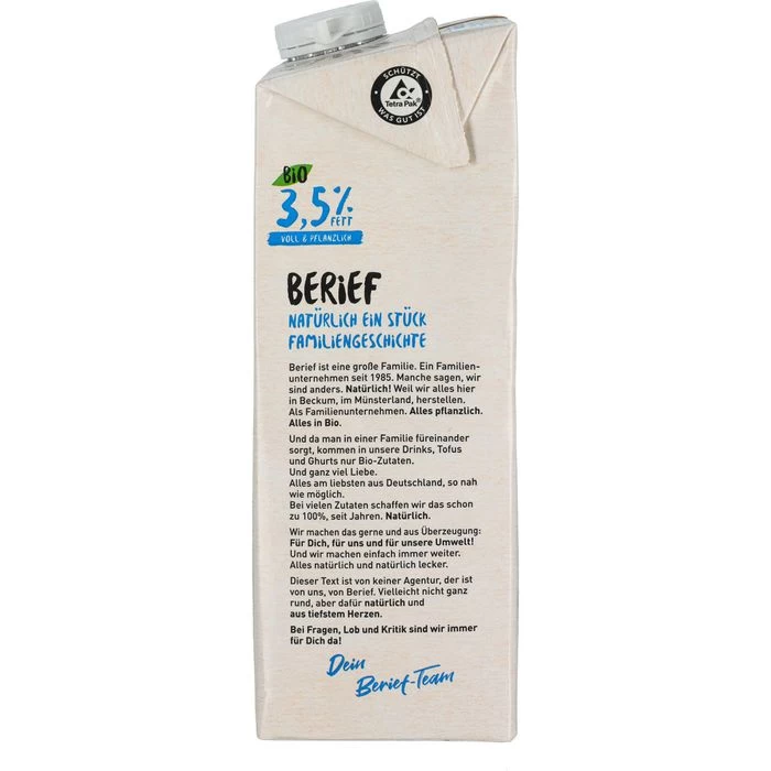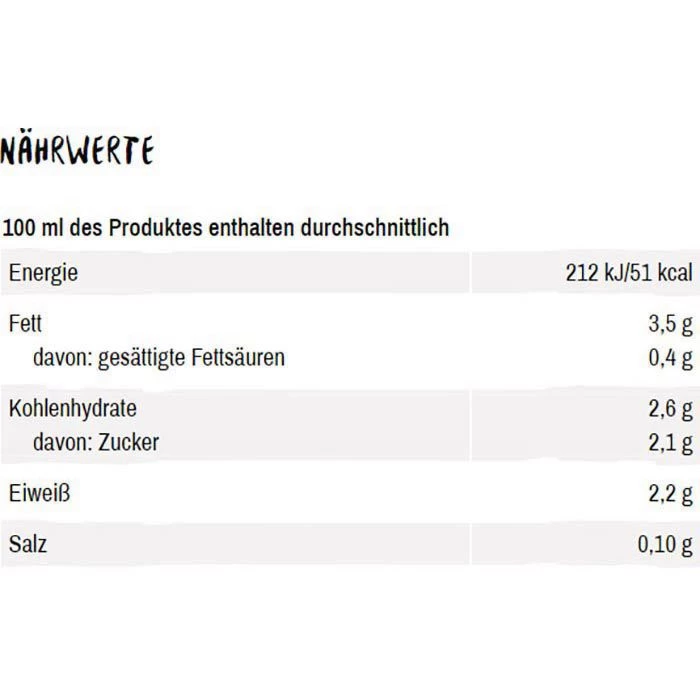 Zutaten: Trinkwasser, geschälte SOJABOHNEN* (5%), glutenfreier VOLLKORNHAFER* (3%), Sonnenblumenöl*, Sonnenblumenkernmus*, Meersalz, Verdickungsmittel: Guarkernmehl*