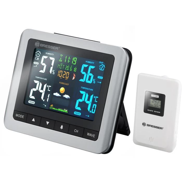 sonstiges: 1-Tages-Wettervorhersage durch Wettertrend-Symbole, Anzeige in °C oder °F, mehrfarbiges beleuchtetes LC-Display, Batteriewechselanzeige, zum Stellen oder Hängen