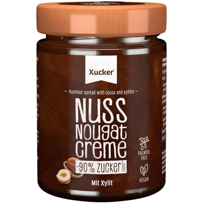 Zutaten: HASELNÜSSE (33%), pflanzliche Fette und Öle in veränderlichen Gewichtsanteilen (Kakaobutter, Sonnenblumenöl), Süßungsmittel: Xylit (30%); Kakao schwach entölt