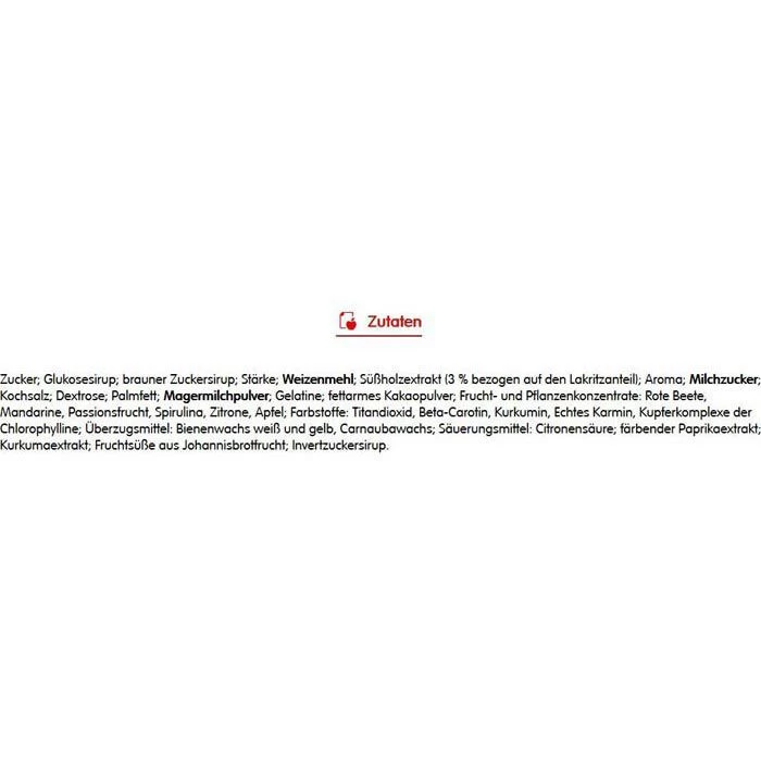 Zutaten: Glukosesirup; brauner Zuckersirup; Zucker; WEIZENMEHL; Stärke; Süßholzextrakt (3 % bezogen auf den Lakritzanteil); Aroma; Kochsalz; MILCHZUCKER; Dextrose; Kokosraspeln; MAGERMILCHPULVER; Palmfett; Säuerungsmittel: Citronensäure; Gelatine; Frucht- und Pflanzenkonzentrate: Saflor, Apfel, Karotte, Rote Beete, Paprika, Zitrone, Spirulina, Hibiskus, Tomate, Kürbis, Holunderbeere, Orange, Schwarze Johannisbeere, Mango, Passionsfrucht, Aronia, Traube; Farbstoff: Titandioxid; Überzugsmittel: Bienenwachs weiß und gelb, Carnaubawachs; Holunderbeerextrakt; Karamellsirup; Invertzuckersirup