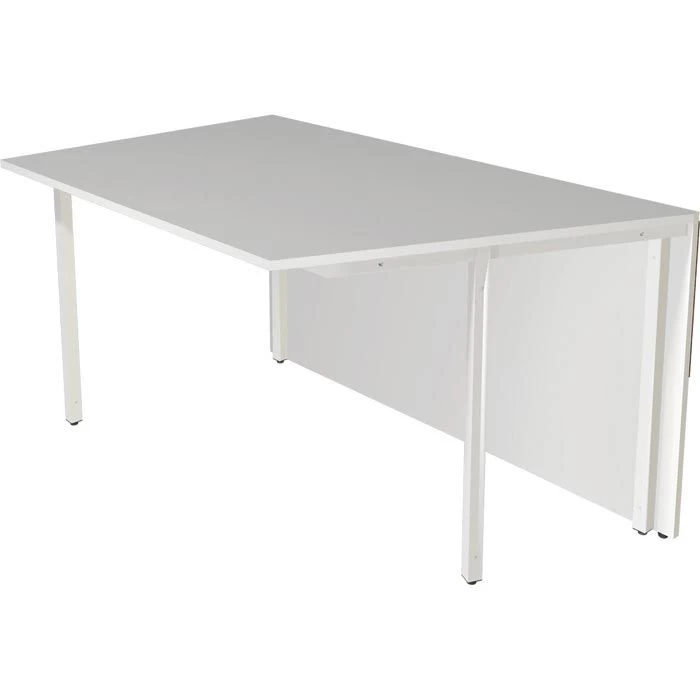 sonstiges: Theke bestehend aus 2 Thekenelementen, einem Anbautisch, zwei Taschenablagen und zwei Seitenblenden, Arbeitsplatte 75 cm hoch mit drei 60 mm Kabeldurchlassdosen, melaminharzbeschichtete E1-Qualitäts-Spanplatte, 2 mm starke ABS-Kanten, Arbeitsplatte, Ablageplatte und Seitenblenden 19 mm stark, Front mit zwei 20 mm hohen Edelstahlstreifen, Front- und Seitenblenden mit 4 mm starkem Einscheibensicherheitsglas, rückseitig weiß lackiert, Metallteile pulverbeschichtet