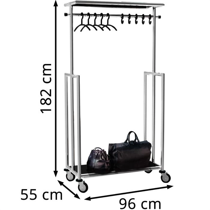 sonstiges: aus verchromtem Stahl, große gehwegtaugliche Rollen aus Gummi, mit Wandabweisern, einer Kleiderstange, großzügige gummibelegte Hut- und Taschenablage