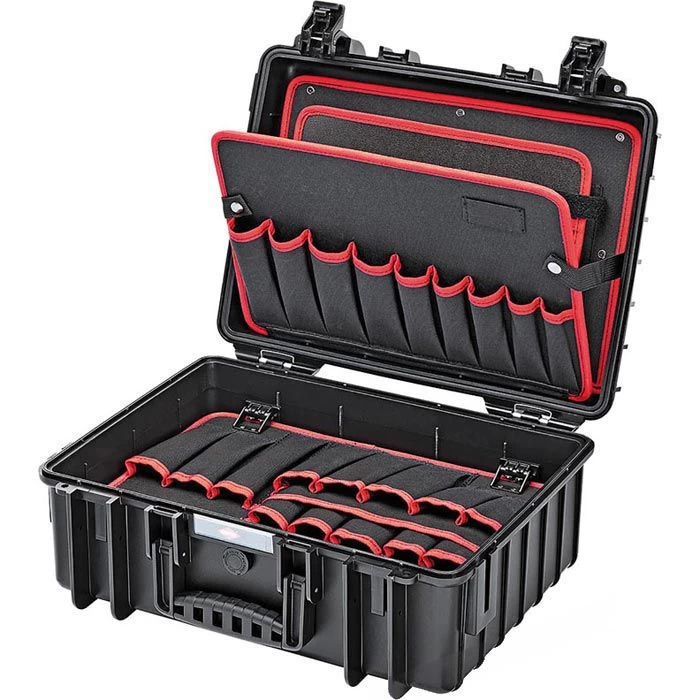 sonstiges: flugtauglicher Koffer aus schlagfestem Polypropylen, staub-, luft- und wasserdicht, automatisches Druckausgleichventil, temperaturstabil von -30°C bis +80°C, 2 Werkzeugtafeln mit insgesamt 35 bestückbaren Werkzeugtaschen, insgesamt 49 Steckmöglichkeiten, Dokumentenfach, Bodenschale: Höhe durch 2 Aluminium-Trennstege unterteilbar, belastbar bis 30kg