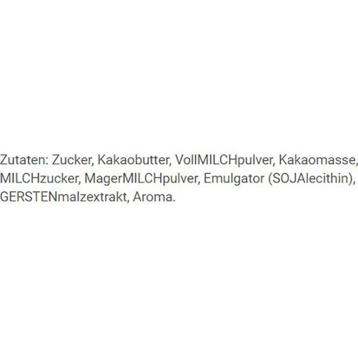 Zutaten: Zucker, Kakaobutter, VOLLMILCHPULVER, Kakaomasse, MILCHZUCKER, MAGERMILCHPULVER, Emulgator (SOJALECITHIN), GERSTENMALZEXTRAKT, Aroma.