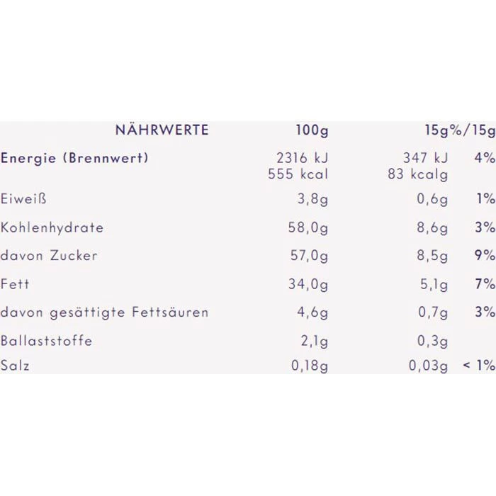 Zutaten: Zucker, Rapsöl (25%), Süssmolkenpulver (aus MILCH), HASELNUSSMASSE (5%), fettarmes Kakaopulver, MAGERMILCHPULVER, Kakaobutter, Sonnenblumenöl, Emulgator (Lecithine), Speisesalz, Aromen.