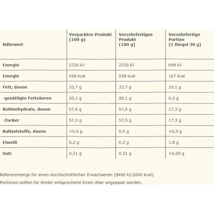 Zutaten: Pflanzliche Fette (Palm, Shea), Zucker, MILCHZUCKER, gezuckerte KONDENSMAGERMILCH (MAGERMILCH, Zucker), MAGERMILCHPULVER, Emulgator (Lecithine), Melasse, Invertzuckersirup, Salz, Aroma.