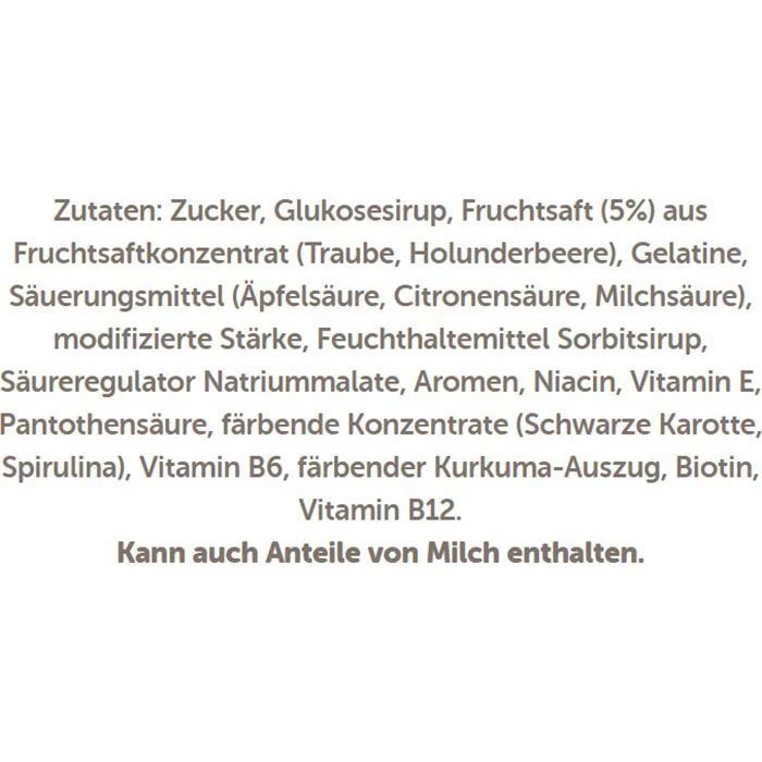 Zucker, Glukosesirup, Fruchtsaft (5%) aus Fruchtsaftkonzentrat (Traube, Holunderbeere), Gelatine, Säuerungsmittel (Äpfelsäure, Citronensäure, Milchsäure), modifizierte Stärke, Feuchthaltemittel Sorbitsirup, Säureregulator Natriummalate, Aromen, Niacin, Vitamin E, Pantothensäure, färbende Konzentrate (Schwarze Karotte, Spirulina), Vitamin B6, färbender Kurkuma-Auszug, Biotin, Vitamin B12.