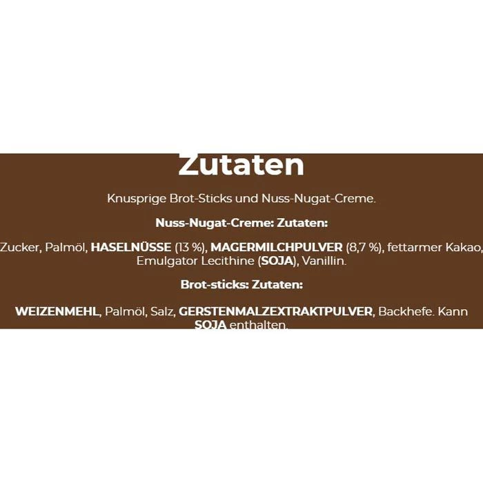 Zutaten: Nuss-Nugat-Creme: Zutaten: Zucker, Palmöl, HASELNÜSSE (13 %), MAGERMILCHPULVER (8,7 %), fettarmer Kakao, Emulgator Lecithine (SOJA), Vanillin.