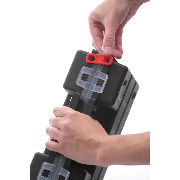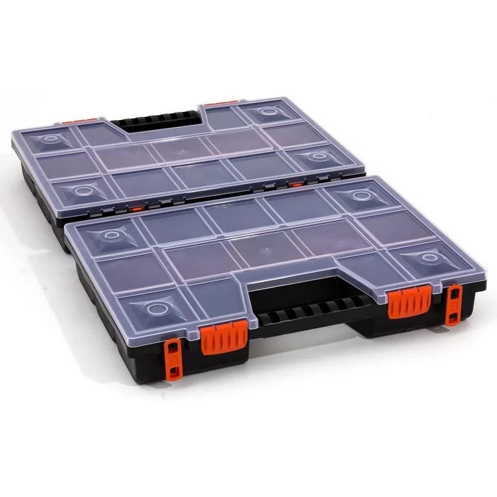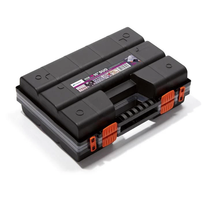 sonstiges: Set aus 2 Organizer durch Clips miteinander verbunden, auch separat verwendbar, mit verriegelbarem, transparentem Deckel, Griff und variabler Inneneinteilung durch je 10 individuell positionierbare Teilerelemente, spezielle Konstruktion des Deckels hält Kleinteile und Einsätze an ihrem Platz, zum Ordnen, Sortieren und Aufbewahren von kleinen und größeren Utensilien, ideal geeignet für den gemeinsamen Transport von Werkzeugen und dem passenden Verbrauchsmaterial