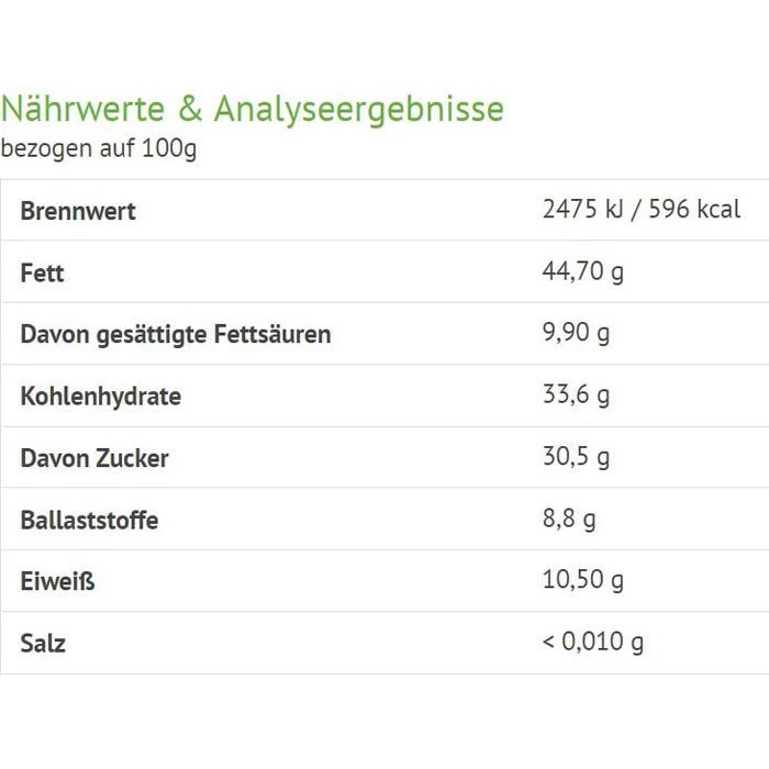 Zutaten: HASELNÜSSE (45%), Vollrohrzucker, Rohrzucker, Kakaopulverstark entölt (15%), Palmöl, Bourbon Vanille